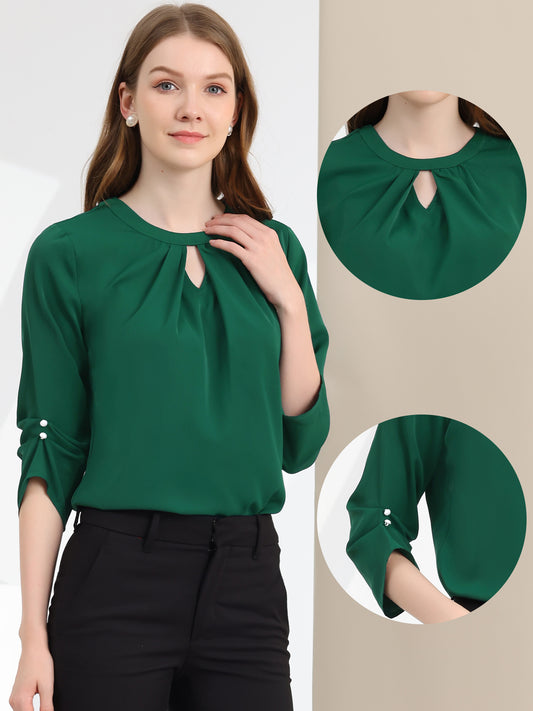 Women's Dressy Work Office Keyhole Pleated Front Ruched 3/4 Sleeve Chiffon Shirt