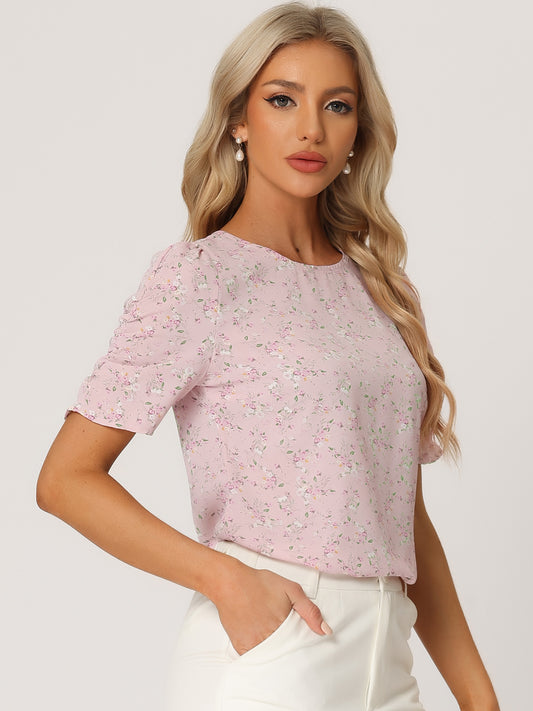 Women's Floral Crew Neck Summer Shirred Short Sleeve Blouse