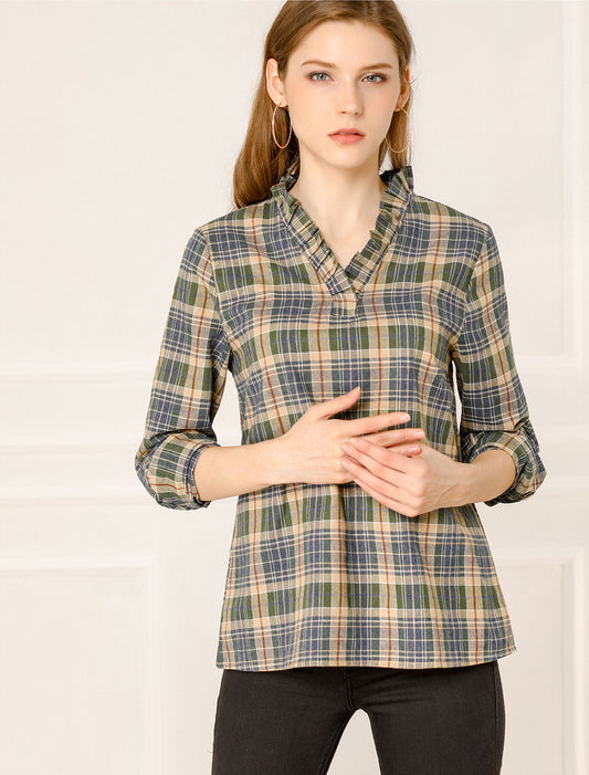 Women's Ruffle Collar Cotton Plaid Long Sleeve V Neck Blouse