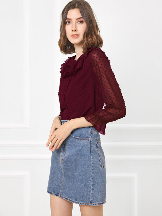 Women's Swiss Dots Bracelet Sleeves Chiffon Boho Ruffle Neck Blouse