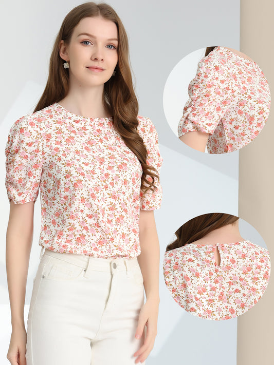 Women's Floral Crew Neck Summer Shirred Short Sleeve Blouse