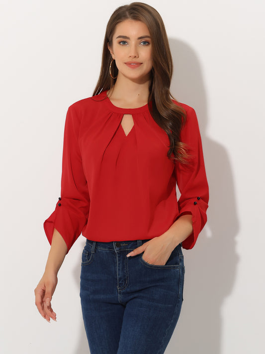 Women's Dressy Work Office Keyhole Pleated Front Ruched 3/4 Sleeve Chiffon Shirt
