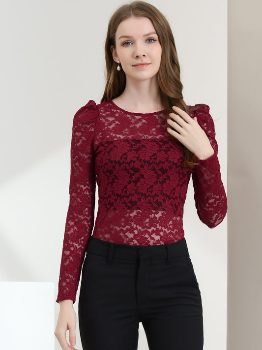 Women's Lace Embroidery Semi Sheer Vintage Puff Sleeve Top