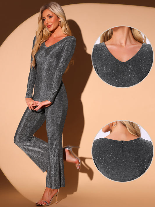 Mono de mujer con purpurina, pierna ancha brillante, sexy, escote en V, para fiesta en club