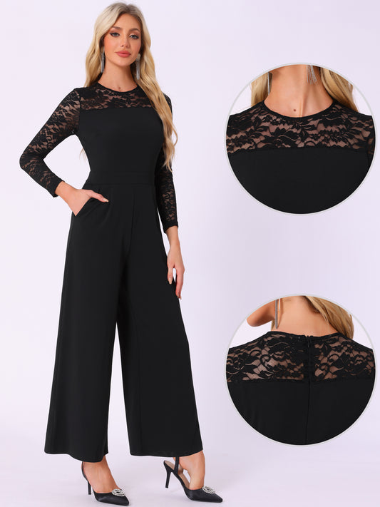 Mono de fiesta para mujer, elegante, con cuello redondo, malla, mangas de encaje, holgado, pierna ancha