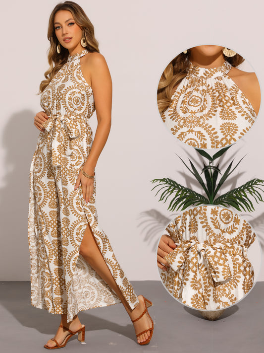 Mono informal sin mangas para mujer, estampado bohemio, con lazo, cuello halter, abertura para playa, pantalones de pierna ancha