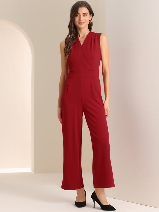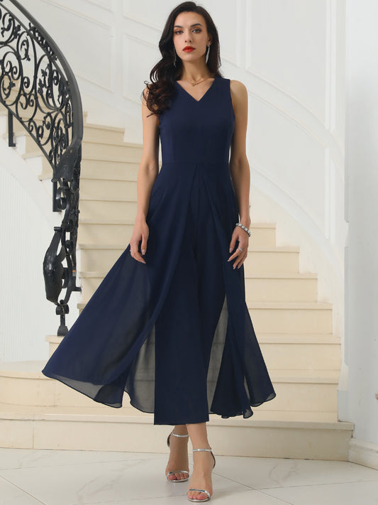 Mono de cóctel sin mangas con cuello en V y pierna ancha para mujer de gasa