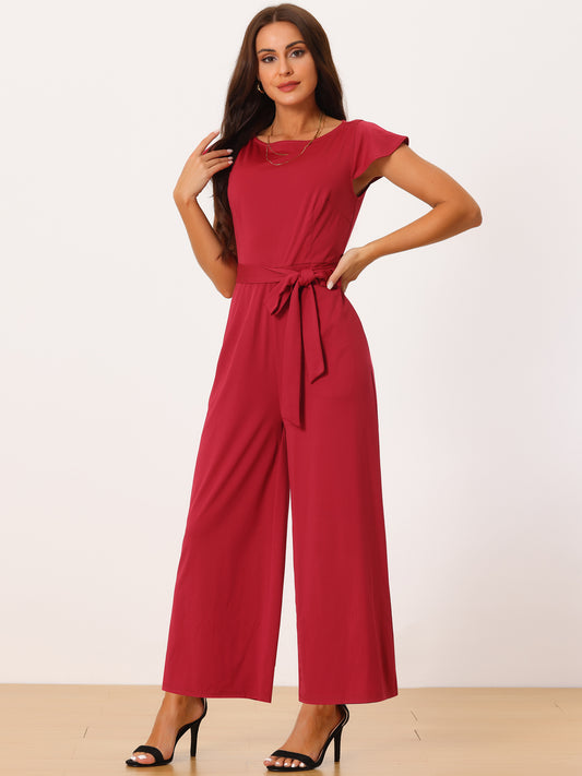 Mono informal de mujer con cuello redondo, volantes, mangas cortas, cinturón, cintura alta, pierna ancha y bolsillos