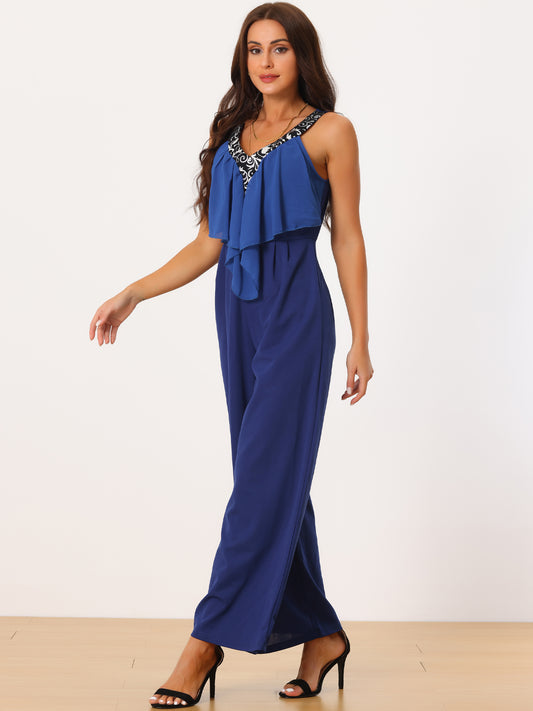 Monos sin mangas de verano para mujer, elásticos, con cuello en V, pierna ancha, pantalones largos, mono con volantes