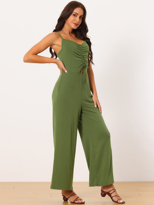 Mono largo de pierna ancha con tirantes finos, sin mangas, fruncido con cordón frontal y cuello en V para mujer