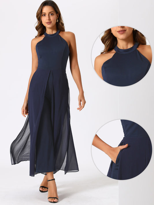 Mono elegante de verano para mujer, sin mangas, con cuello halter, de gasa, para boda, con pierna ancha y elegante
