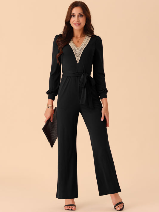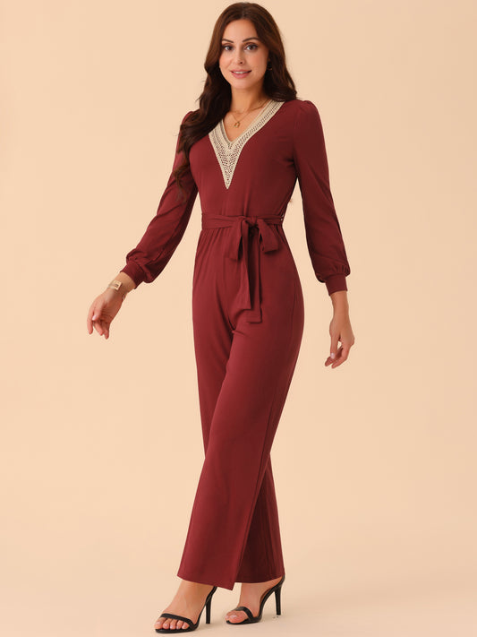 Mono de mujer con cuello en V, manga larga, cinturón, pierna ancha, elástico, pantalón largo con bolsillos