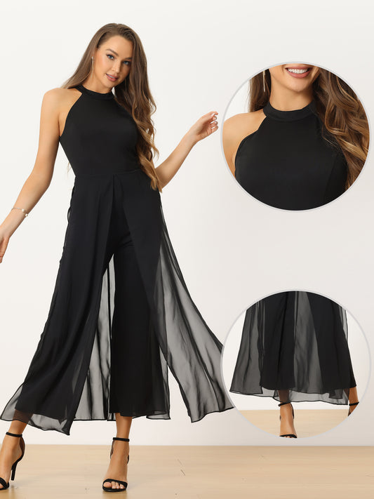 Mono elegante de verano para mujer, sin mangas, con cuello halter, de gasa, para boda, con pierna ancha y elegante