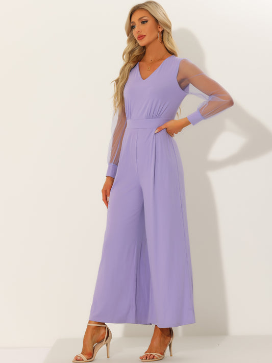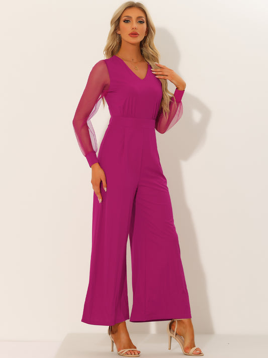 Mono elegante de cóctel para mujer, con escote en V, de malla, manga larga, holgado y pierna ancha