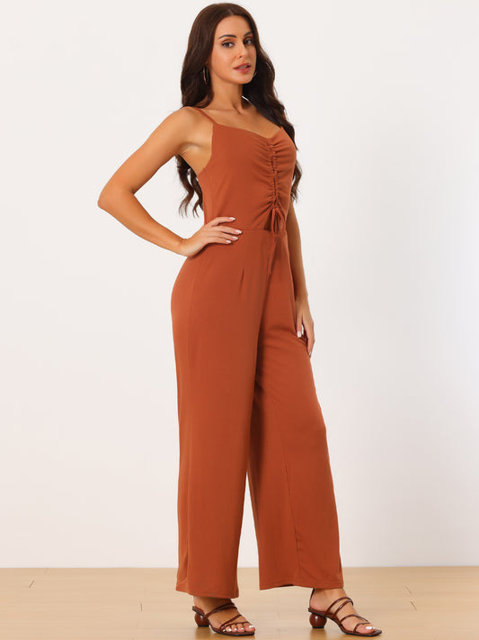 Mono largo de pierna ancha con tirantes finos, sin mangas, fruncido con cordón frontal y cuello en V para mujer