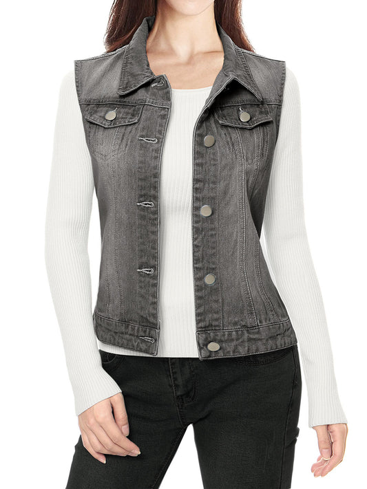 Women's Buttoned Washed Denim Vest Jacket W Chest Flap Pockets