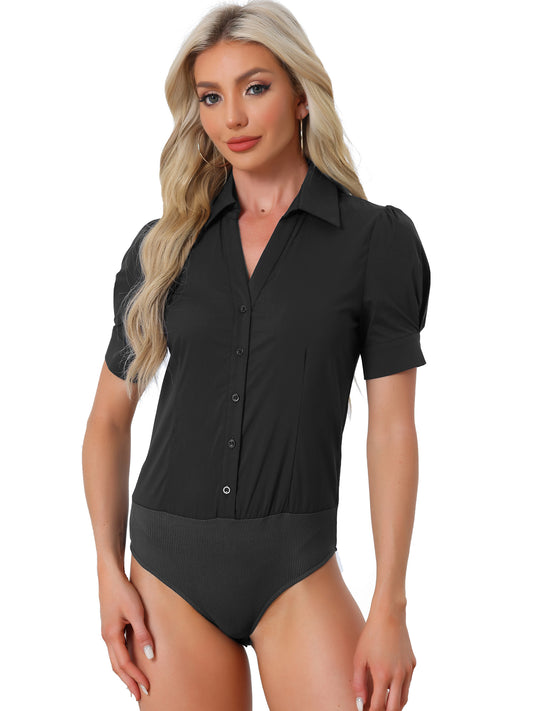 Women's Button Down Leotard Shirt Short Sleeve Collared Business Work Bodysuit Top