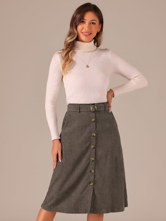 Women's Fall Button Front Belted Corduroy High Waist Midi Skirt
