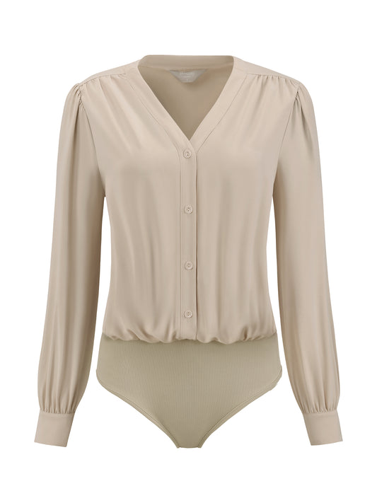 Women's Button Down Bodysuit Long Sleeve V Neck Classic Business Work Shirt Top