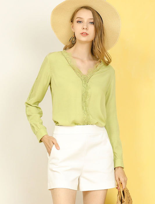 Women's V Neck Casual Sweet Patchwork Crochet Lace Blouse Top