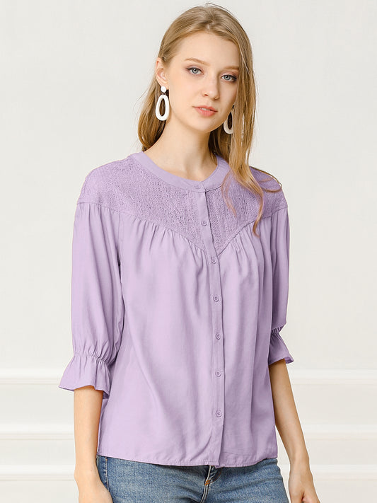 Women's Lace Panel 3/4 Sleeve Round Neck Button Down Blouse