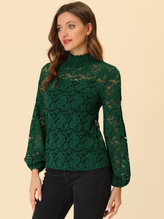 Women's Floral Lace Turtleneck Puff Long Sleeve See Through Sheer Blouse