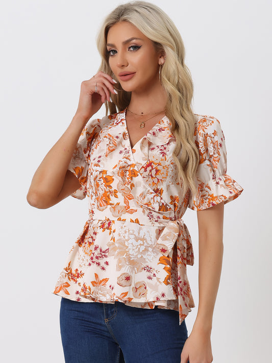 Blusa cruzada floral de manga corta con volantes, cuello en V y cinturón para mujer