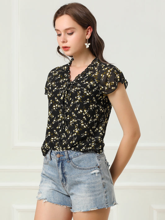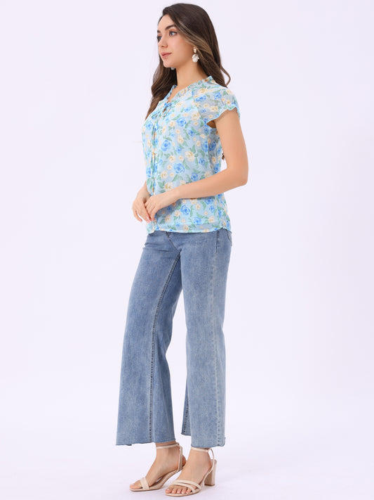 Blusa de gasa con volantes, mangas cortas y cuello en V con estampado floral de verano para mujer