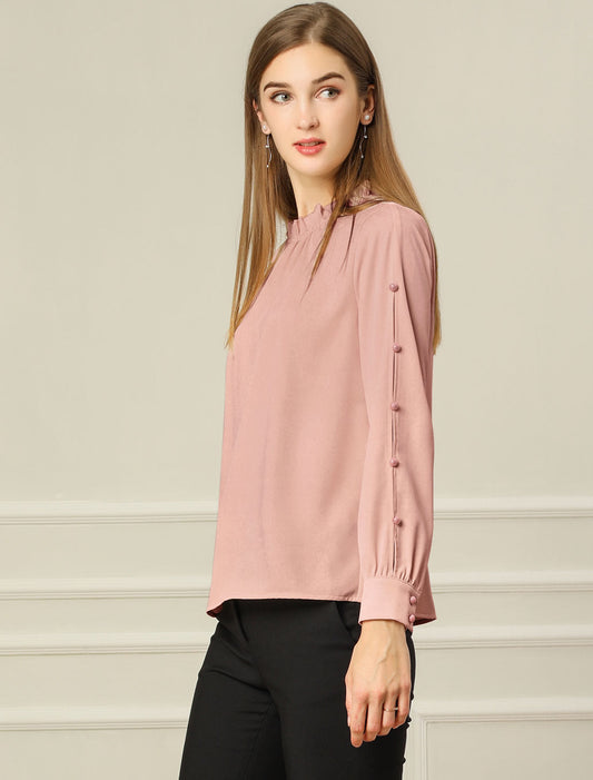 Blusa de gasa para mujer con cuello alto fruncido y cuentas de perlas, manga larga
