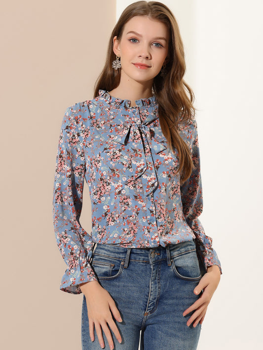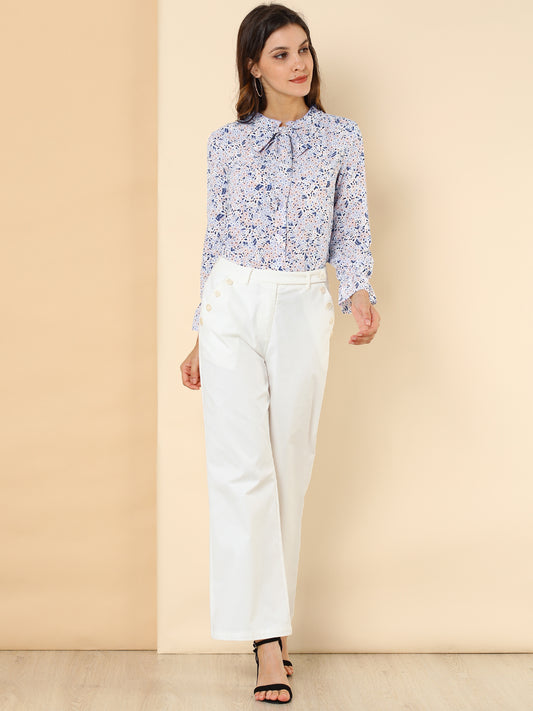 Blusa informal con cuello fruncido y botones con lazo floral para mujer