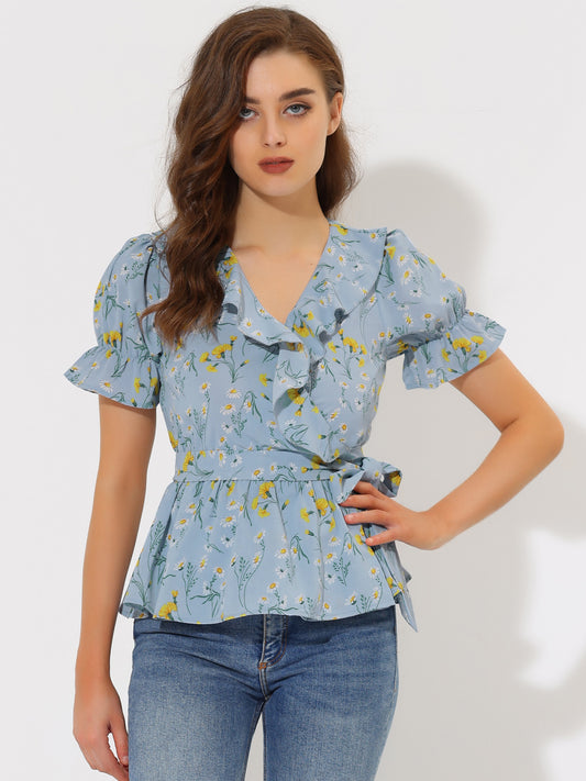Blusa cruzada con volantes y cuello en V cruzado para mujer
