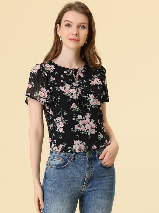 Blusa informal de verano de manga corta con cuello alto y estampado floral con volantes para mujer