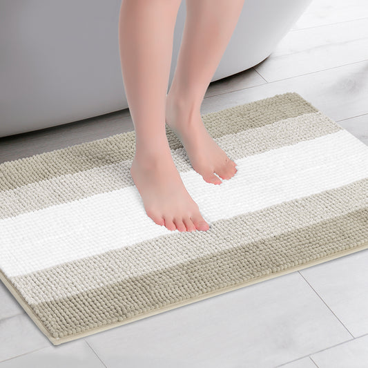 Striped Chenille Bathroom Rug with Edges, Non-Slip Bathroom Floor Mat, Machine Washable