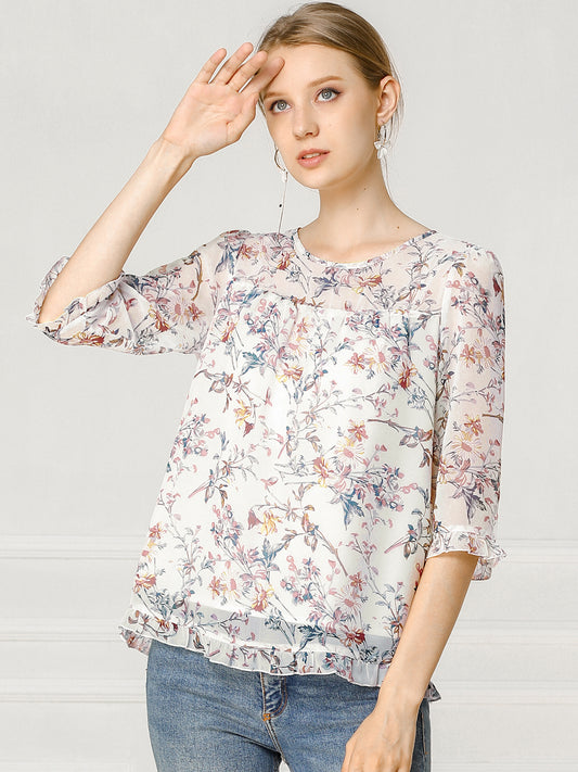 Blusa informal de gasa con estampado floral y mangas 3/4 con volantes para mujer