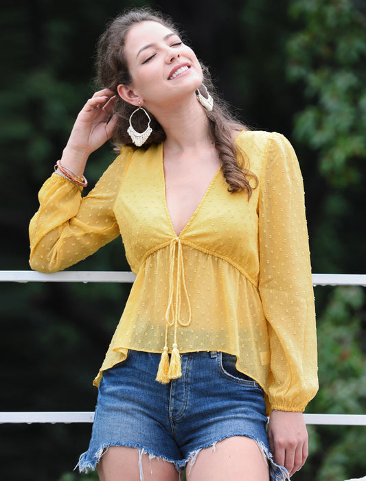 Blusa de gasa con escote en V profundo para mujer, lunares suizos, dobladillo con volantes, manga larga y peplum