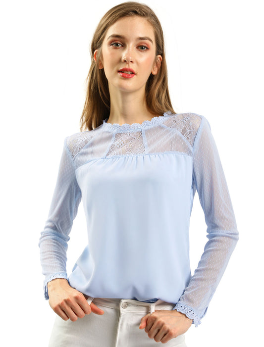 Blusa elegante de gasa con encaje de malla transparente y manga larga para mujer