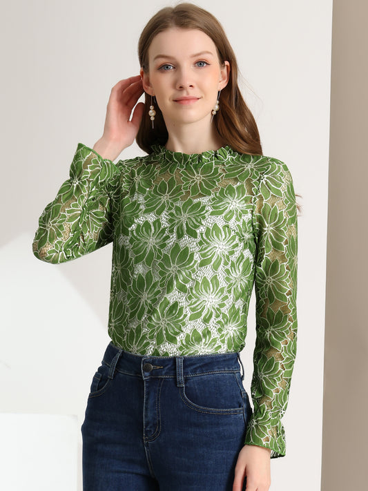 Blusa elegante de encaje floral con mangas largas y cuello con volantes y transparencias para mujer