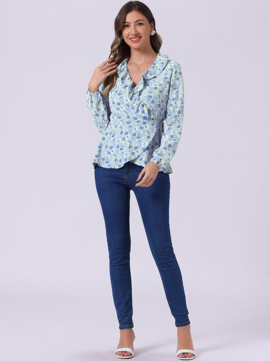 Blusa peplum con volantes, cuello en V y mangas largas con lazo en la cintura para mujer