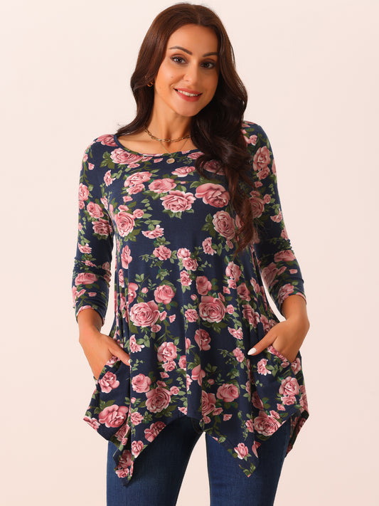 Blusas de mujer con mangas 3/4, cuello redondo, estampado floral, corte holgado, dobladillo asimétrico y bolsillos