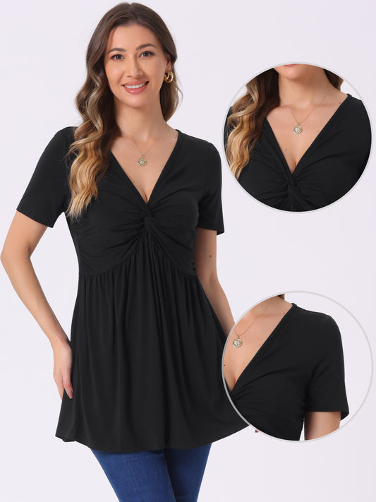 Blusa de verano con cuello en V anudado para mujer, manga corta, estilo túnica oversize, color liso