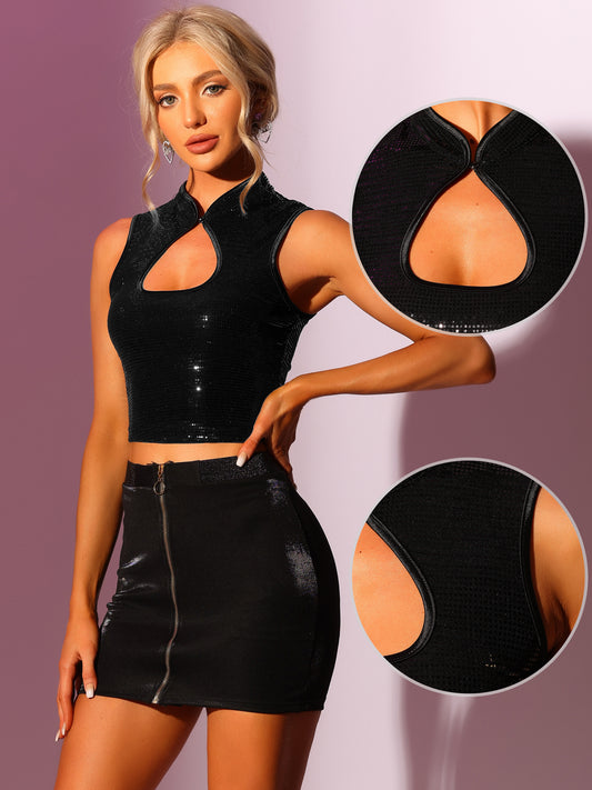 Top corto sin mangas con corte frontal para mujer, ajustado y con lentejuelas