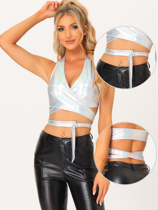 Top halter metálico para mujer con escote en V profundo y espalda descubierta, top corto holográfico, ropa de club