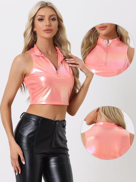 Top corto metálico para mujer, cuello alto, cremallera, sin mangas, brillante, holográfico