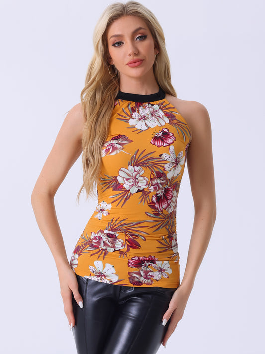 Top sexy de fiesta fruncido con cuello halter, sin mangas, elástico y ajustado para mujer