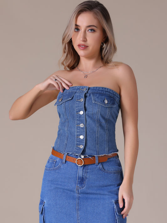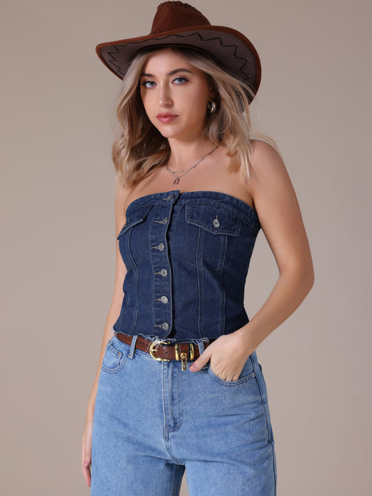 Tops de tubo de mezclilla para mujer con botones al frente, dobladillo sin rematar, espalda fruncida, top bandeau corto sin tirantes