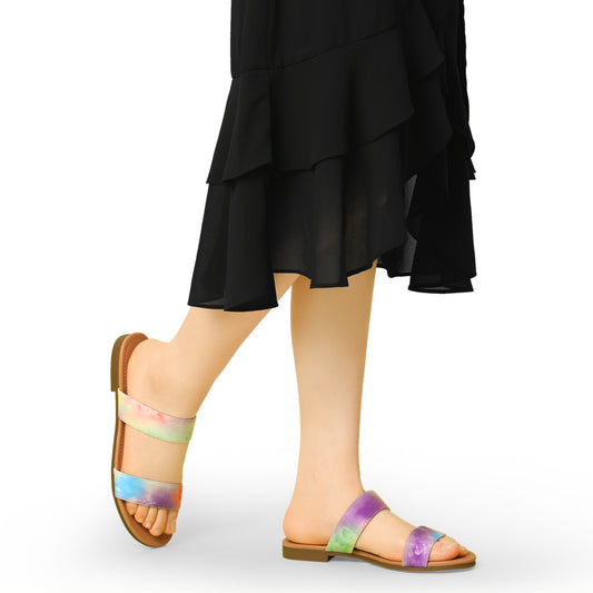 Sandalias planas fluorescentes con tiras dobles y efecto tie-dye para mujer