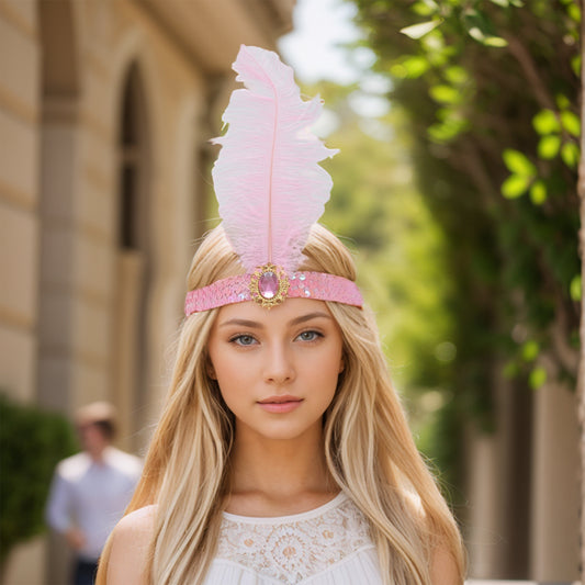 Diadema con plumas y lentejuelas de imitación de diamante para mujer, color rosa, 1 unidad