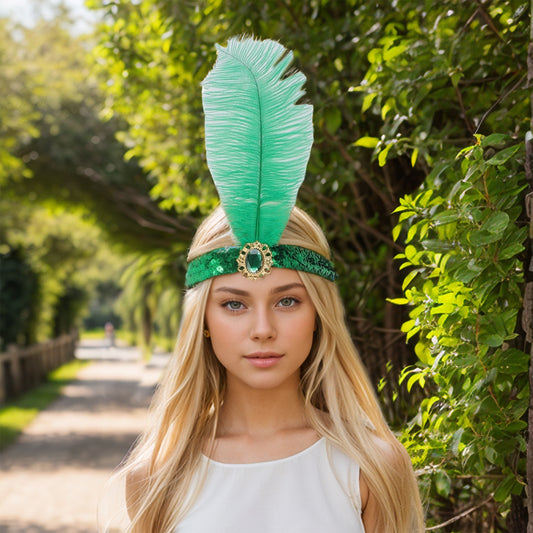 Diadema con plumas y lentejuelas de imitación de diamante para mujer, color verde, 1 unidad