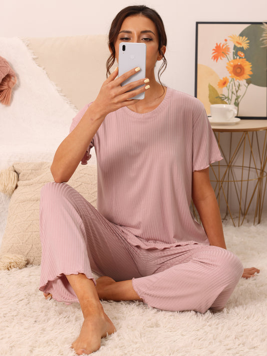 Conjunto de pijama capri de manga corta con cuello redondo y camisa de punto para mujer