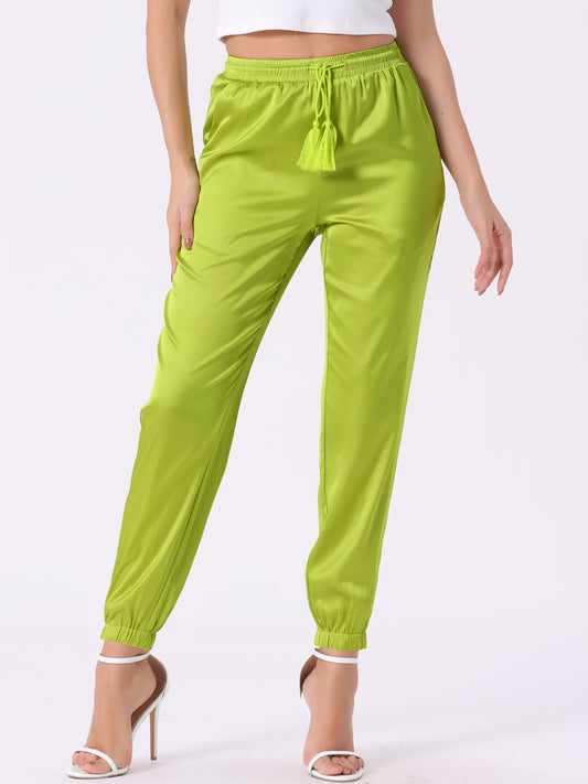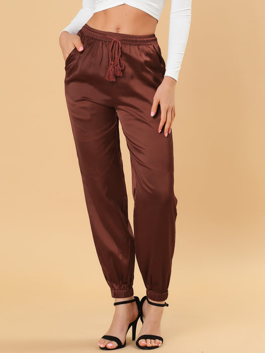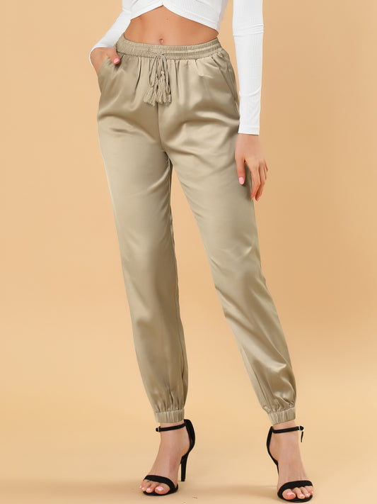 Pantalones deportivos casuales de satén con cintura elástica y cordón para mujer, largos hasta el tobillo, con bolsillo